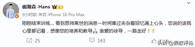 杨瀚森发文送别恩师:刚刚结束训练… 看到恩师离世的消息一时间难过夹杂着回忆涌上心头,您说的话我心里都记着,感谢您的培养和教导[祈祷] 亲爱的徐导,一路走好。