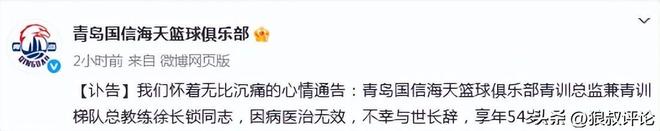 北京时间10月7日,根据青岛男篮官方社媒公示,我们怀着无比沉痛的心情通告:青岛国信海天篮球俱乐部青训总监兼青训梯队总教练徐长锁同志,因病医治无效,不幸与世长辞,享年54岁。