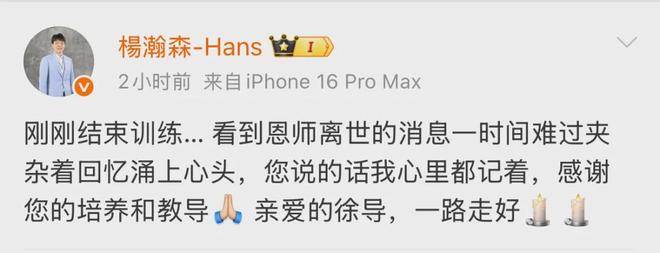 “刚刚结束训练。看到恩师离世的消息一时间难过夹杂着回忆涌上心头,您说的话我心里都记着,感谢您的培养和教导。亲爱的徐导,一路走好。”杨瀚森在社交媒体这样写道。